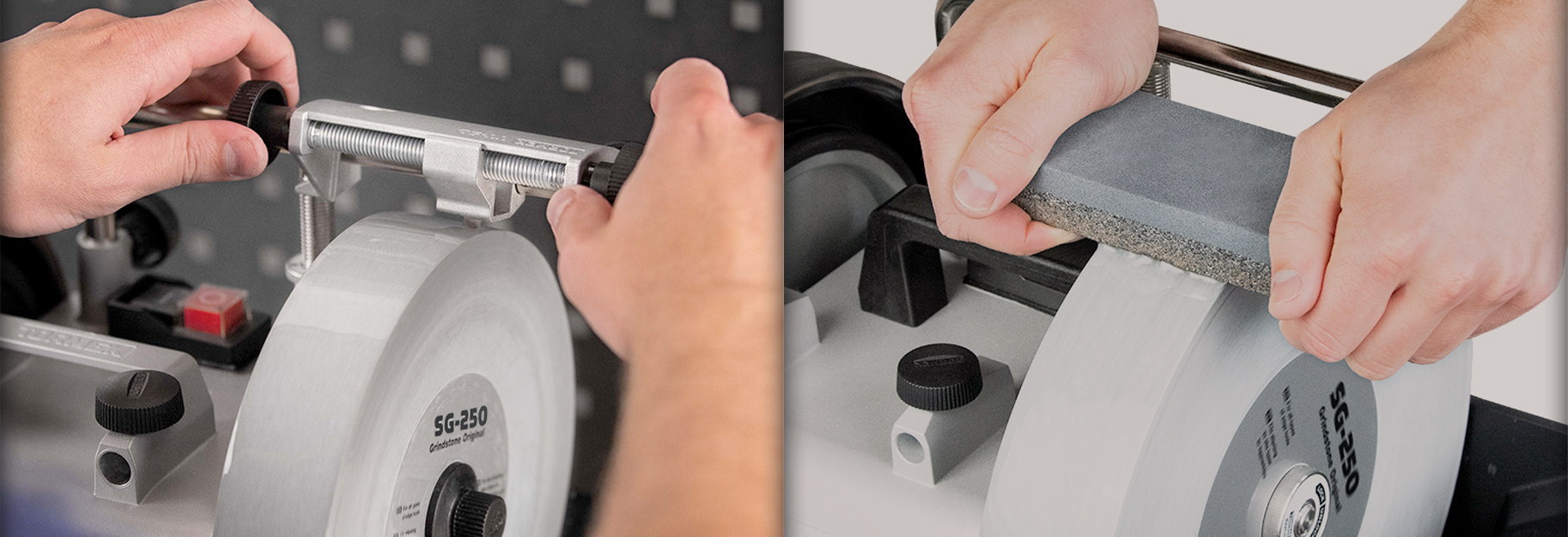 Cuando el bisel se ve uniforme y la línea de sombra del filo casi desaparece, gradúa la SG-250 a fino.