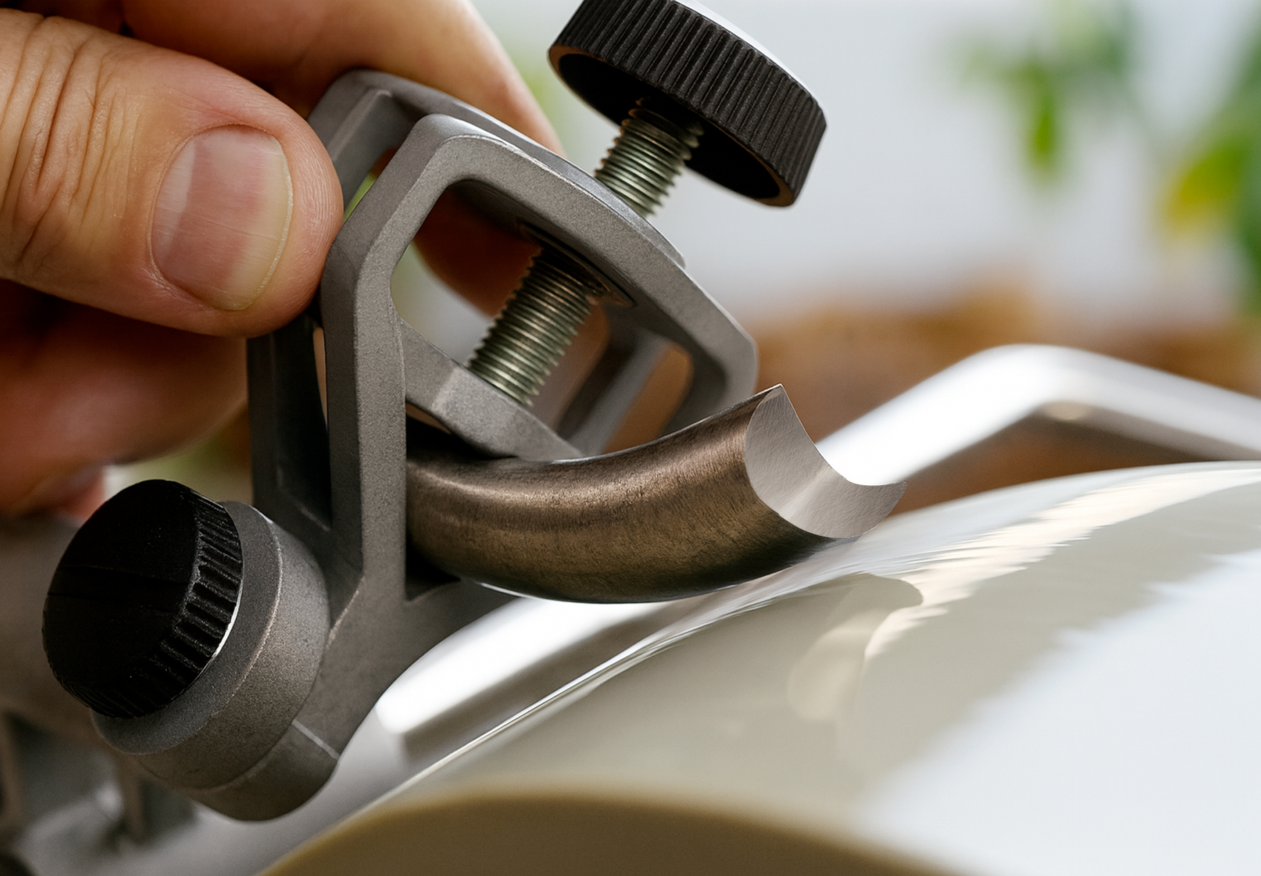 Aprende cómo recuperar una gubia con el filo destrozado y dejarla como nueva con la Tormek T-8, la guía SVD-186 R y la rueda de cuero LA-120. Sin sobrecalentar el acero ni perder geometría.